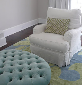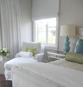 Although this is a bedroom, I like this color scheme and feel for a living room. (I'm thinking maybe yellow and grey bedroom, but I'll get to that in another post. Yes, Mom, I am thinking of stealing your idea.) Really, the room is good inspiration for everything. The color scheme is serene, but not boring with pops of the bright blues and greens against the crisp white. But I also love the over all feel of modern traditional. You've got the contemporary lines of the chandelier, rug and bed with the traditional skirted chairs and tufted bench and ottoman. I love the balance and simplicity. Let's be real, though. I cannot paint my living room white, and white furniture in a living room is just ridiculous unless you live in the palace displayed above only, using that room once every five years, banning children from even looking at it. So, how do I translate Brooke's room into my living room while working with what I have?